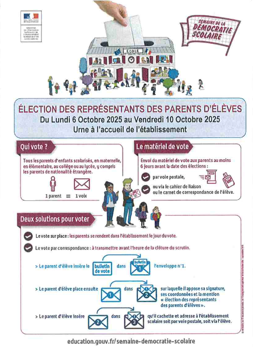 Les élections des représentants des parents d’élèves se tiendront le vendredi 10 Octobre 2025.